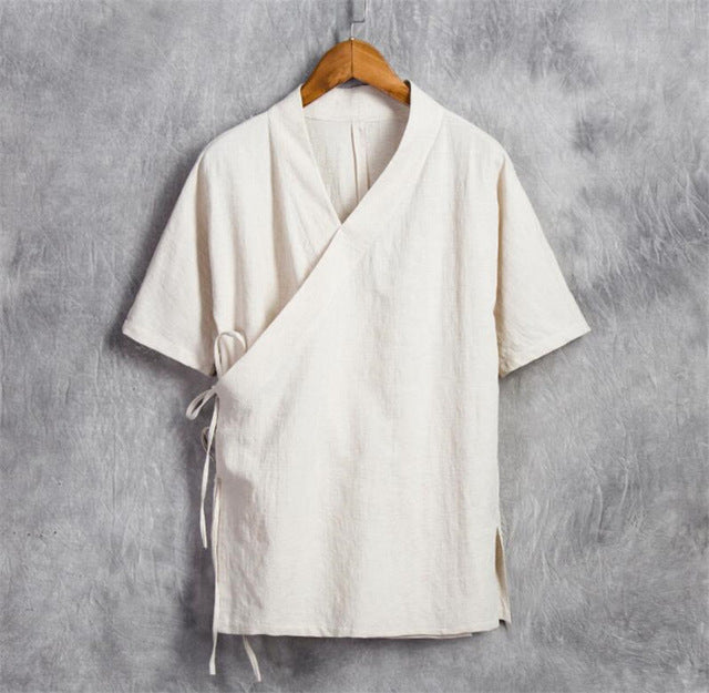 Item Type: ShirtsGender: MenMaterial: Linen,CottonBrand Name: AsyabuykalPattern Type: SolidShirts Type: Casual ShirtsSleeve Length(cm): ShortClosure Type: BeltCollar: V-NeckStyle: Chinese styleFabric Type: BroadclothSleeve Style: Regular
